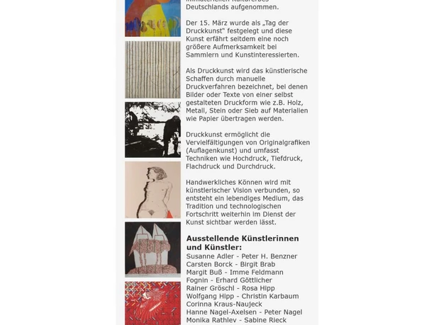 Der 15.03. ist der „Tag der Druckkunst“. In ganz Deutschland werden Ausstellungen gezeigt, die sich mit der Druckkunst befassen. Den Kuratorinnen Marlies Seemann Rzadkiewicz, Rosa und Wolfgang Hipp ist es gelungen, 19 sehr bekannte Künstler nach Kappeln zu holen. Das Kunsthaus Kappeln hat diesen Tag auf eine Ausstellung von 3 Wochen verlängert. Zur Eröffnung werden zahlreiche Künstlerinnen und Künstler erscheinen.
