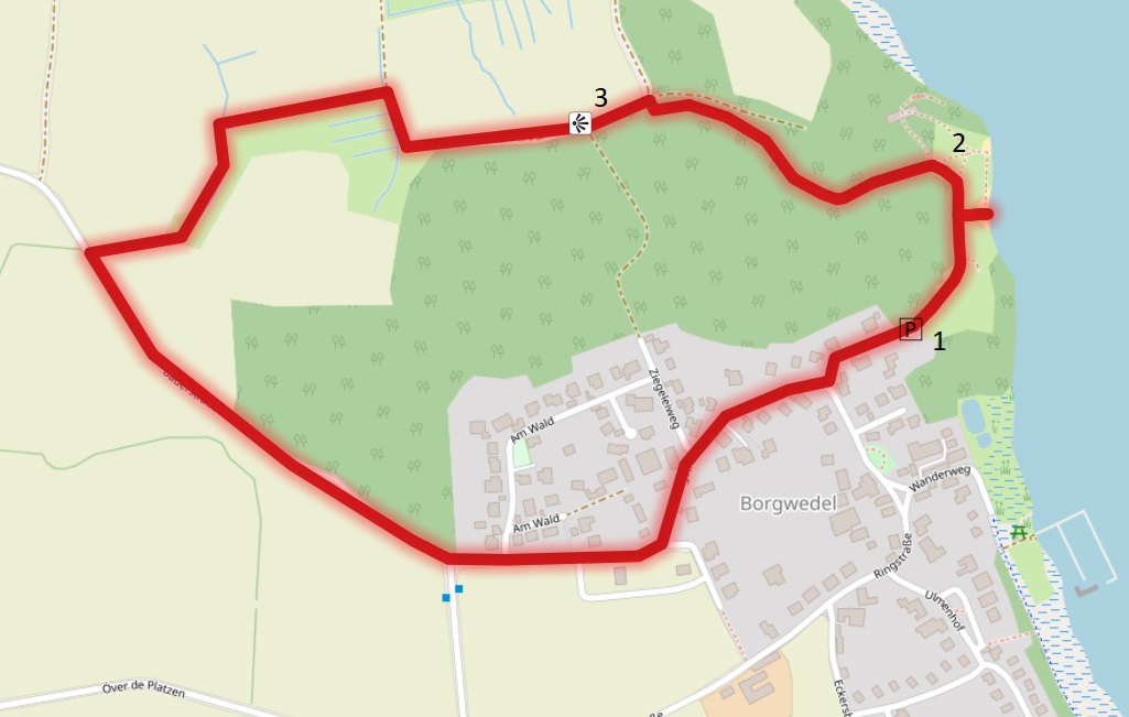 In Borgwedel vereinen sich die durch Sukzession entstandenen Bruchwaldbestände des Naturerlebnisraumes Ziegelei Borgwedel mit einer sich in der Entwicklung befindenden Lagune an der Schlei. Der Startpunkt ist der Parkplatz des Naturerlebniszentrums am Ende der Straße Achterwisch (1). Von hier aus könnt ihr die Flächen des Geländes erkunden (2). Am Schleistrand hat man einen guten Blick auf die Große Breite, früh morgens kann man hier mit Glück ein in der Nähe brütendes Eisvogelpärchen beobachten. Die auf den früheren Tonabbauflächen durch natürliche Entwicklung entstandenen Bruchwaldbestände sind reich an Sing- und Kleinvögeln. Durch die Verzahnung von Pionierwald, bewaldeten Steilhängen, Stillgewässern, Feuchtgebüschen, Röhrichten, Staudenfluren und offenen, artenreichen Wiesen findet sich hier auch eine artenreiche Vogelwelt. Über den Schleiwiesenweg nach Westen gelangt ihr an eine Senke, welche durch einen Wall von der Schlei getrennt ist (3). Die Fläche wurde vor kurzem für den Naturschutz gesichert und die Entwässerung teilweise eingestellt. Dadurch hat sich eine ca. 8 ha große Wasserfläche gebildet, welche vor allem in der Rastzeit viele Enten, Gänse und Limikolen anzieht. Das Artenspektrum ähnelt dabei sehr dem von Reesholm, welches sich in 2,5 km Entfernung auf der nördlichen Schleiseite befindet. Der Weg führt am Rande des Gebietes (von wo man einen guten Blick auf die Lagune hat) auf die asphaltierte Bäderstraße. Über diese gelangt man zurück ins Dorf und zum Parkplatz.